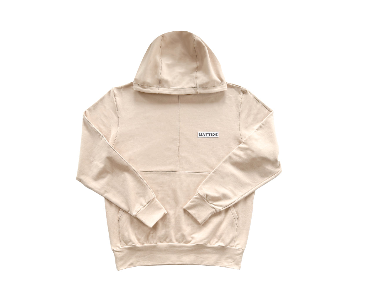 BLUZA Z KAPTUREM UNISEX – BEŻOWA Z CZARNYM PRZESZYCIEM